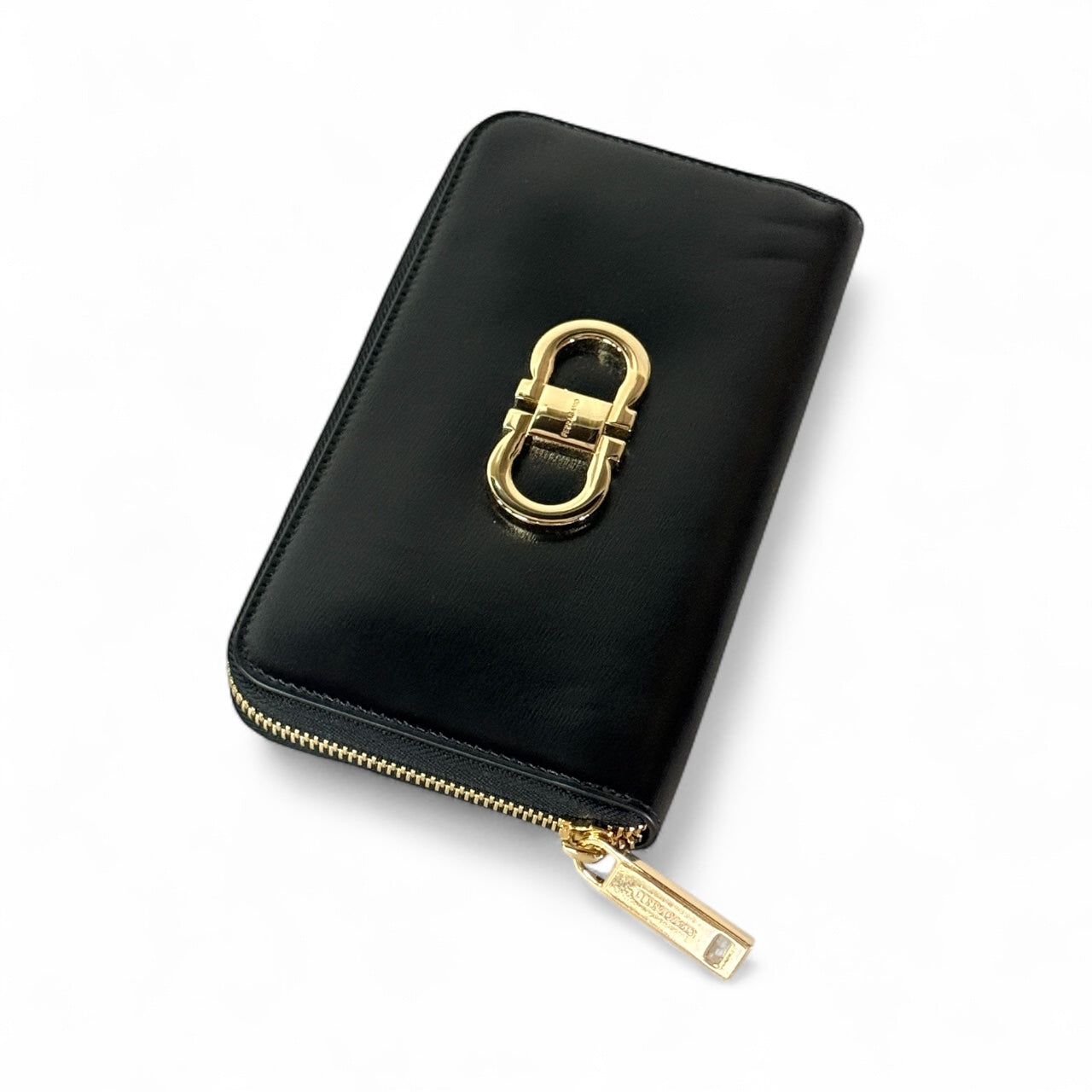 Timeless elegance meets modern functionality in the Ferragamo Gancini Continental Wallet. Expertly crafted in Italy from palmellato calfskin, its textured finish brings subtle sophistication and enduring durability. The gold-finished Gancini emblem, set on a squared plaque with engraved signature, lends a refined accent to its clean silhouette.