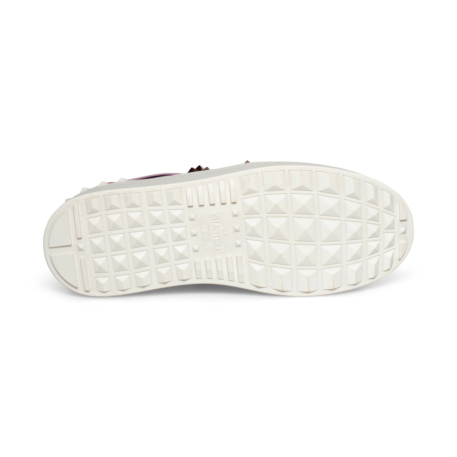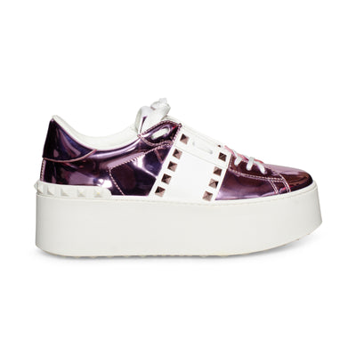 A contemporary expression of Valentino’s artisanal heritage, the Rockstud Untitled Flatform Sneaker combines architectural precision with effortless Italian elegance. Crafted in Italy from smooth calfskin leather in Bianco and Water Rose, the design is elevated by a laminated leather band adorned with platinum-finish Rockstuds, each hand-applied to reflect the maison’s meticulous craftsmanship.